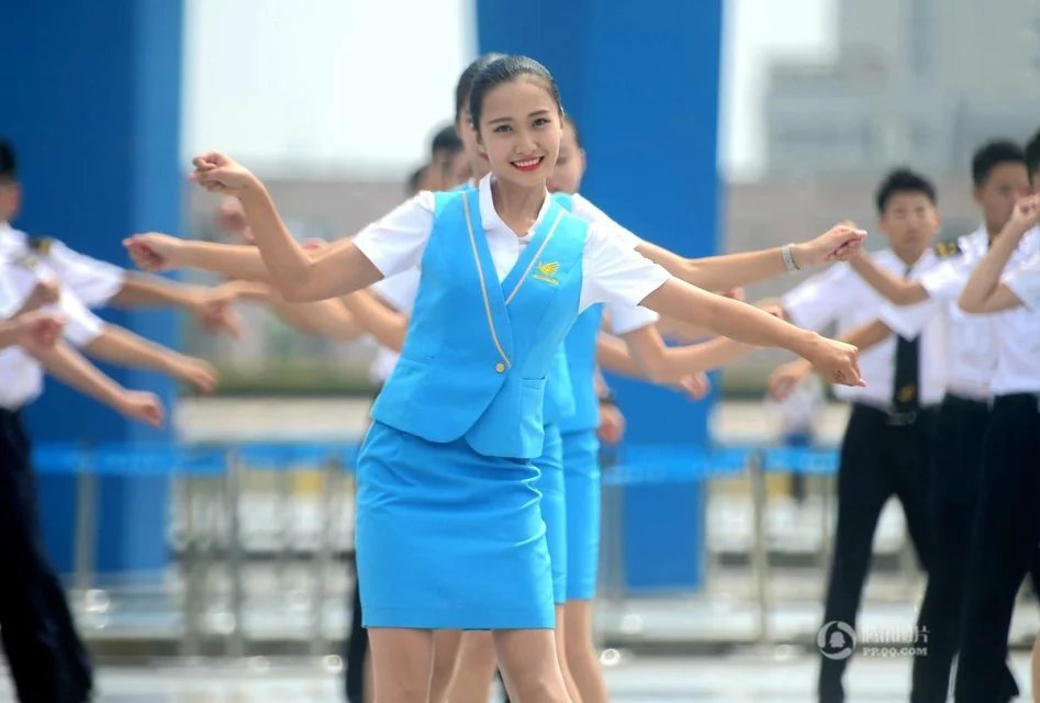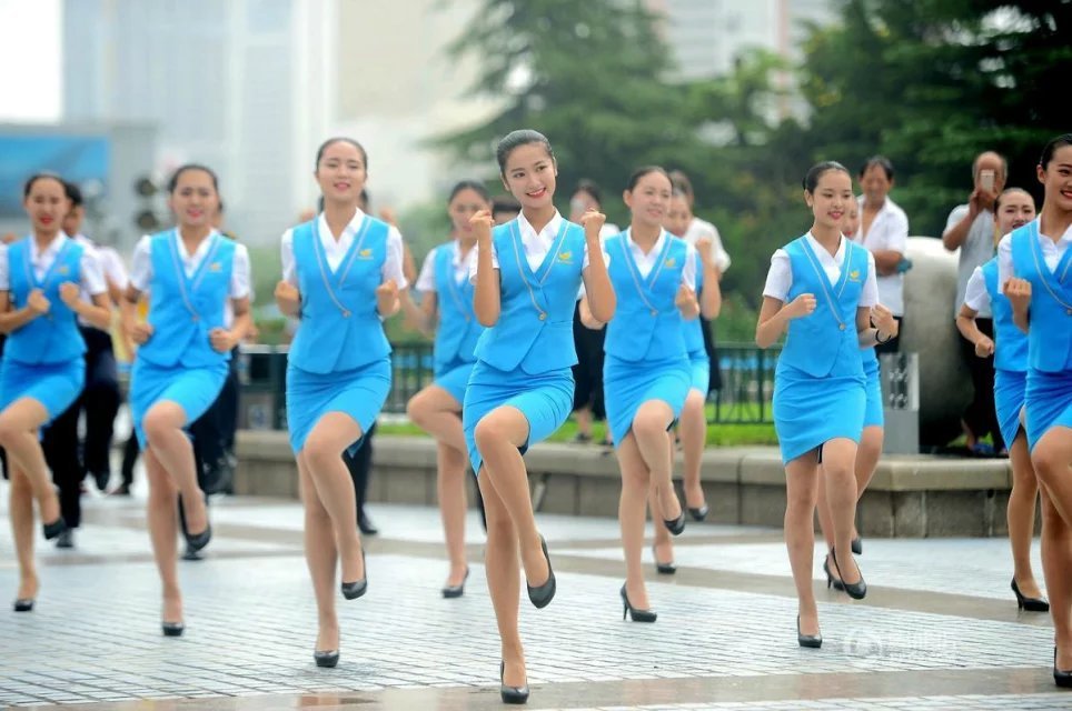 2016年8月8日,山東省濟南市,四百多名空乘培訓學(xué)校的學(xué)生統一身穿空姐制服短裙來(lái)到泉城廣場(chǎng),隨著(zhù)音樂(lè )跳起熱舞,將空乘中的站姿、坐姿、蹲姿、鞠躬等融入舞蹈中,以整齊的舞姿、靚麗的形象和甜美的笑容,展示空乘專(zhuān)業(yè)學(xué)習成果。