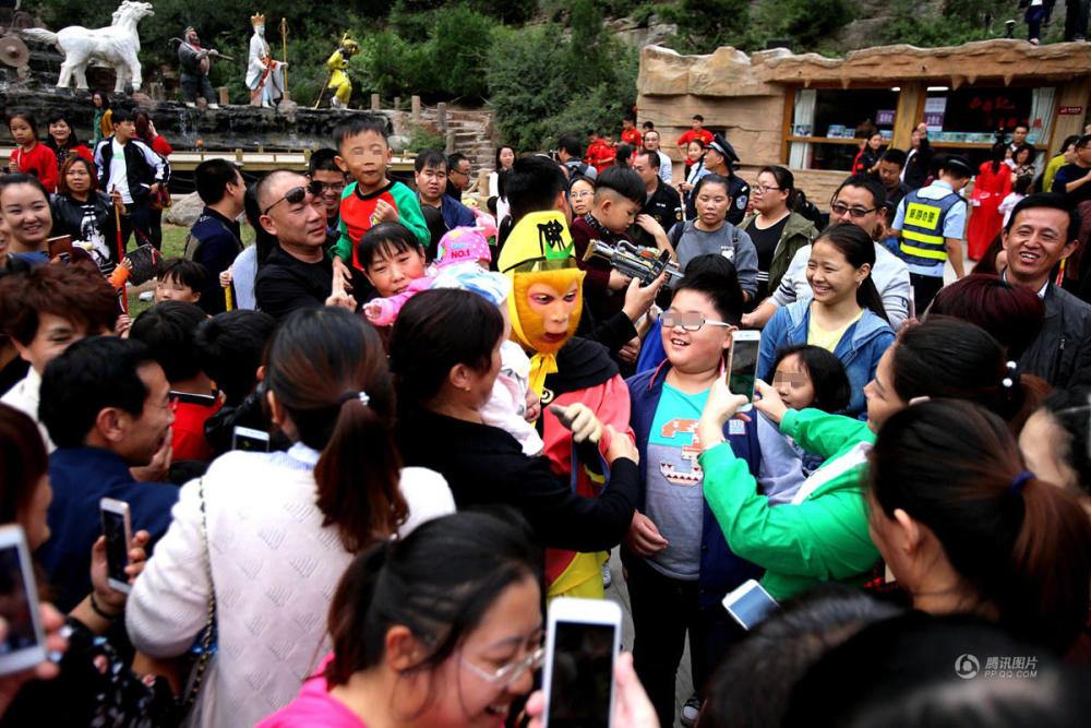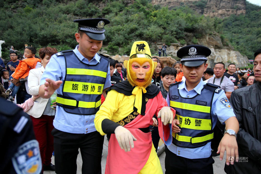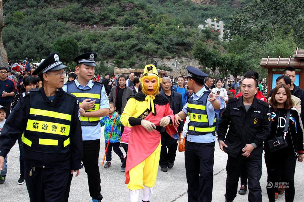 10月6日,河南濟源五龍口,曾因開(kāi)大巴被交警拿住而意外走紅網(wǎng)絡(luò )的“孫大圣”遭上千游客圍追堵截,男女老少爭相求合影,一時(shí)間失了“神通”難以脫身,導致無(wú)法按時(shí)上場(chǎng)演出,只好求助旅游警察前來(lái)解圍。