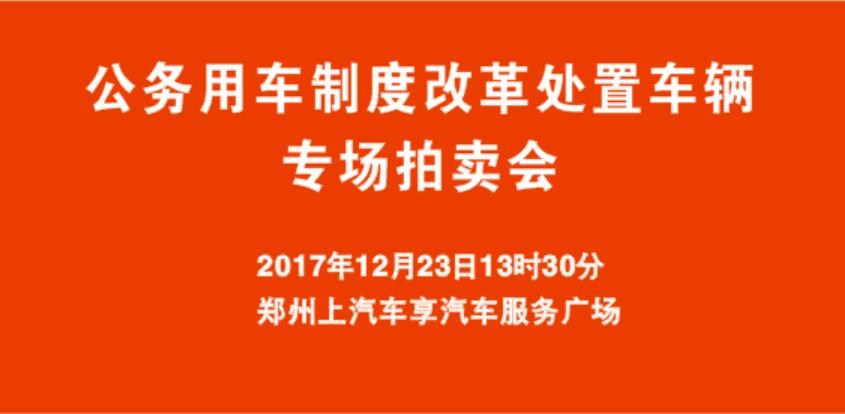 2017年12月23日13時(shí)30分,由河南星光秀文化傳媒承辦的公務(wù)用車(chē)制度改革處置車(chē)輛專(zhuān)場(chǎng)拍賣(mài)會(huì )在上汽車(chē)享汽車(chē)服務(wù)廣場(chǎng)車(chē)享拍鄭州拍賣(mài)大廳公開(kāi)拍賣(mài),此次拍賣(mài)公務(wù)用車(chē)104輛。