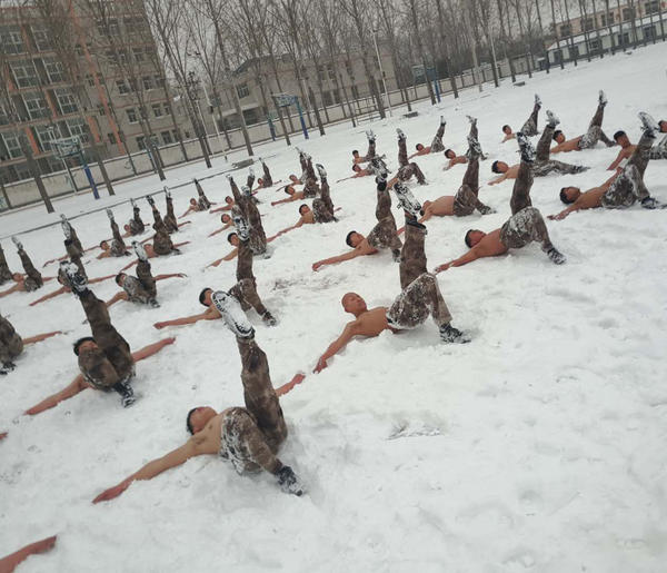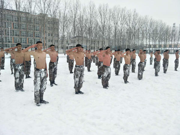 河南全民國防教育中心隊員冰雪中赤膊訓練
