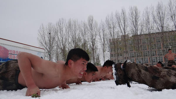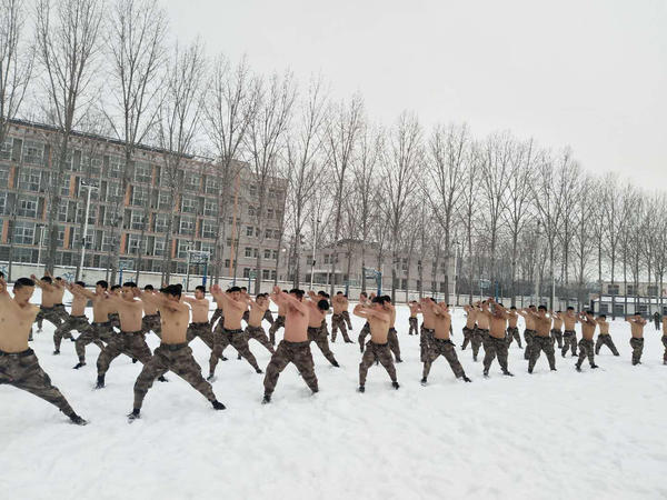 1月4日,氣溫驟降,大雪紛飛,呵氣成霜。下午,一群隊員們卻在雪中拉開(kāi)了一場(chǎng)"抗寒訓練"。原來(lái)他們是河南省全民國防教育中心特組織教導隊的隊員們,為了進(jìn)行雪地抗寒訓練,他們赤膊上陣,進(jìn)行擒敵拳演練、倒功、對練和體能訓練。他們士氣高昂,血氣方剛,一邊揮舞著(zhù)拳腳在冷冽的寒風(fēng)中飛舞,一邊聲嘶力竭地呼喊口號,喊出必勝的信念,喊出無(wú)畏的勇氣。