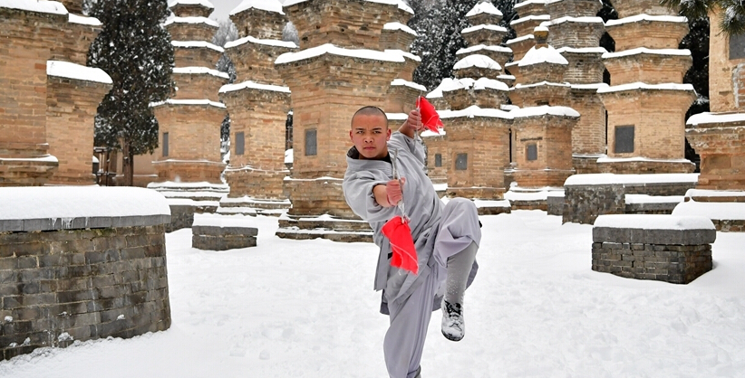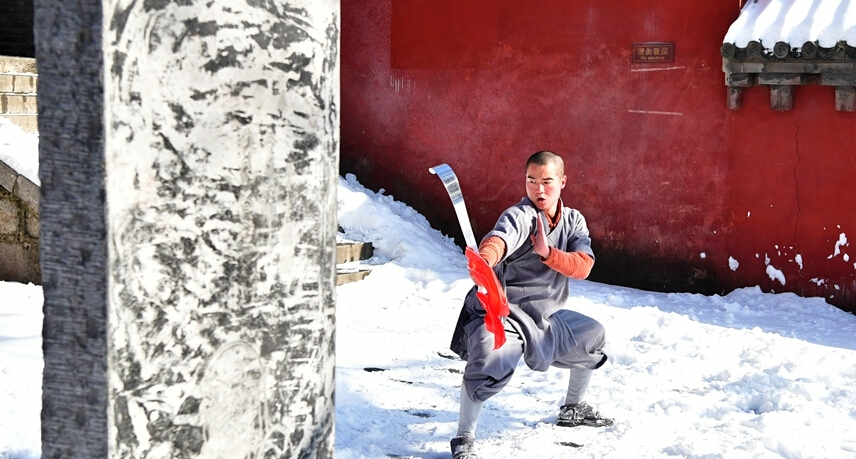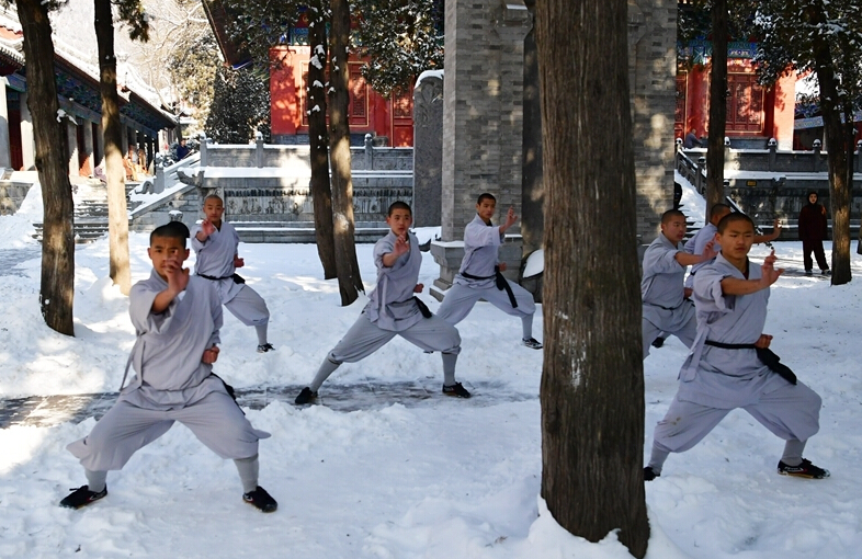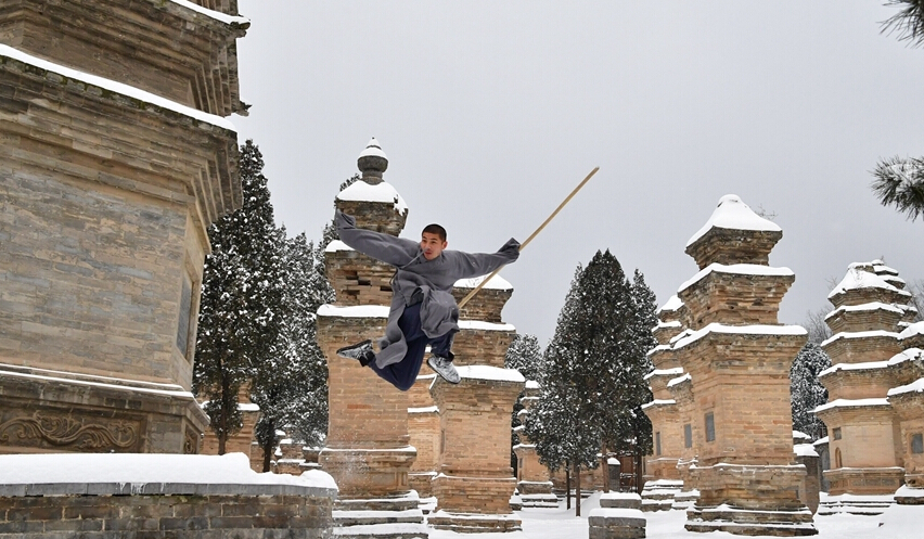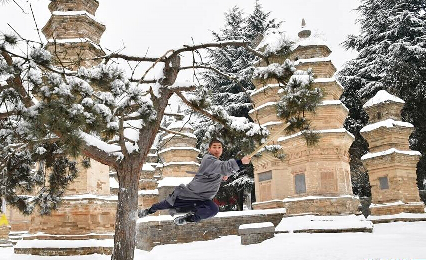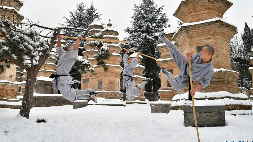 1月5日,武僧在少林寺表演少林傳統拳法。位于河南嵩山五乳峰下的少林寺,是中國漢傳佛教的“禪宗祖庭”和少林武術(shù)的發(fā)源地。連日來(lái)的大雪讓少林披上了一層銀裝,武僧們在雪地中演練武術(shù),一展絕技。