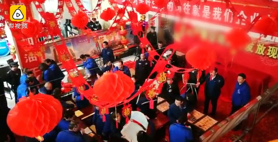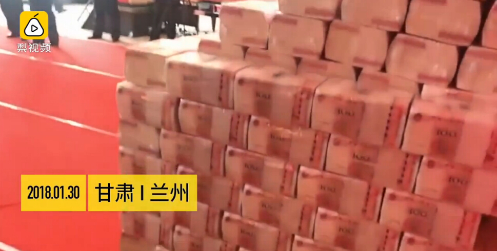 1月30日,甘肅蘭州,某公司給每位員工發(fā)了5萬(wàn)元紅包,年終獎現金堆成一堵墻。