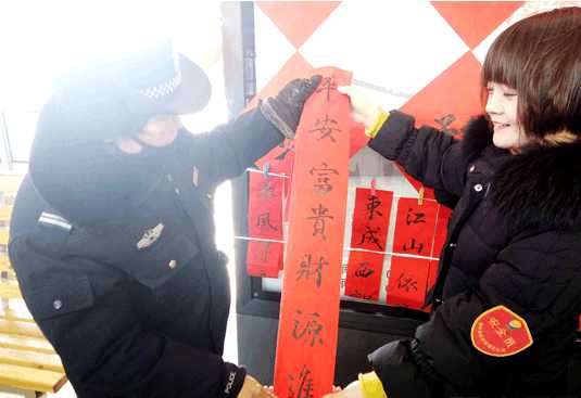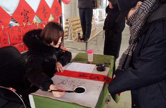 在2018狗年新春即將來(lái)臨之際,1月30日的上午9:00,在農業(yè)路天明路的快速公交站臺之中,一群人圍站在一張小方桌周?chē),方桌旁一個(gè)女孩正拿著(zhù)毛筆書(shū)寫(xiě)著(zhù)一副春聯(lián)。寫(xiě)完的春聯(lián)很快就被一位環(huán)衛工大姐收了去。