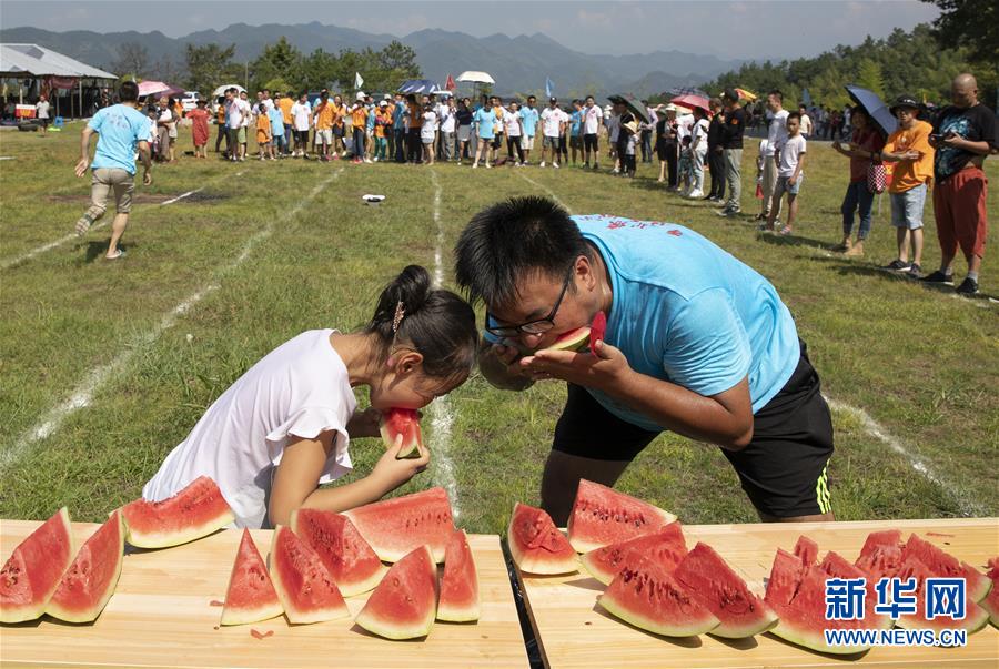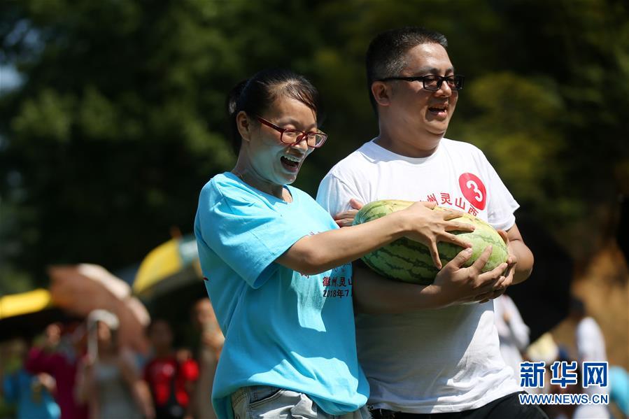 7月29日,在黃山市徽州區靈山村,游客參加西瓜趣味運動(dòng)會(huì )。當日,一場(chǎng)別開(kāi)生面的西瓜趣味運動(dòng)會(huì )在安徽省黃山市徽州區靈山村上演,人們參加吃瓜比拼、西瓜套圈、抱瓜賽跑等趣味比賽,歡樂(lè )度夏。