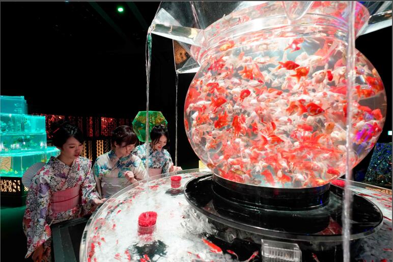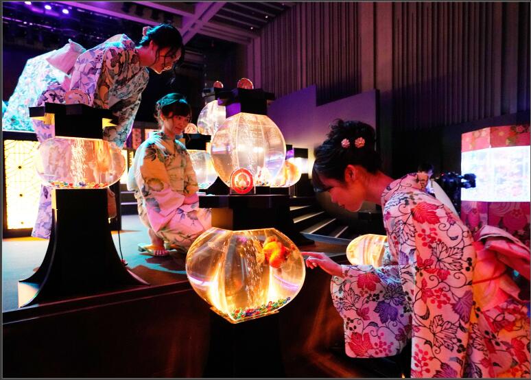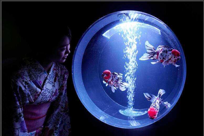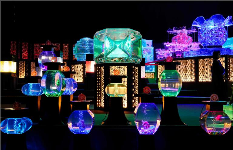 2019年7月4日,日本東京,Art Aquarium 2019 金魚(yú)藝術(shù)展舉行,身穿夏季和服的女孩們在繽紛的光影中觀(guān)賞一萬(wàn)多條五彩的金魚(yú)。