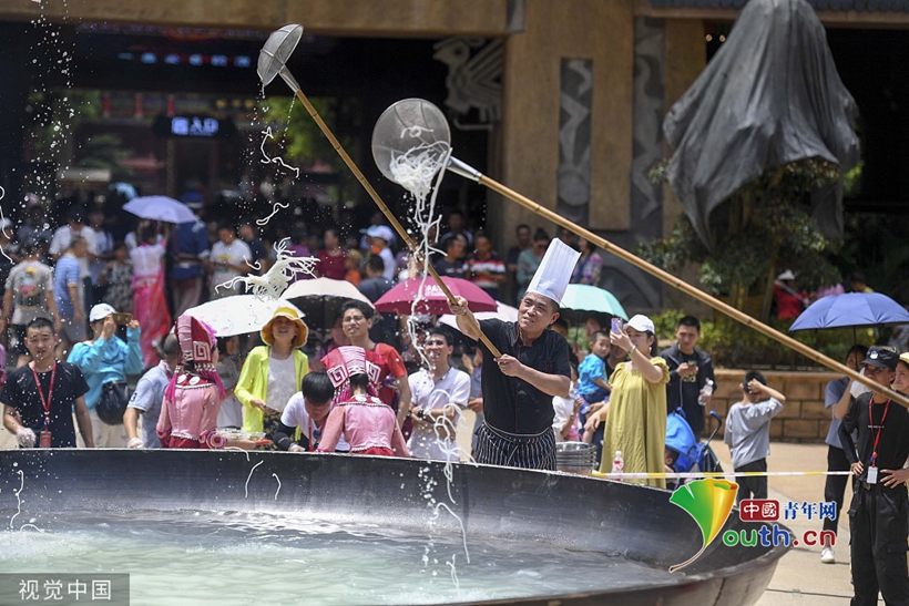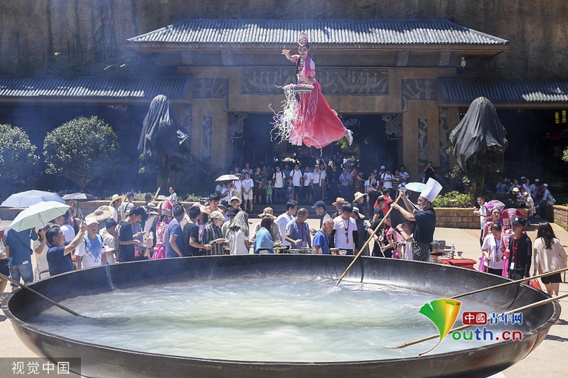 景區架50平米巨鍋烹飪 “仙女”吊在鍋正中下米粉