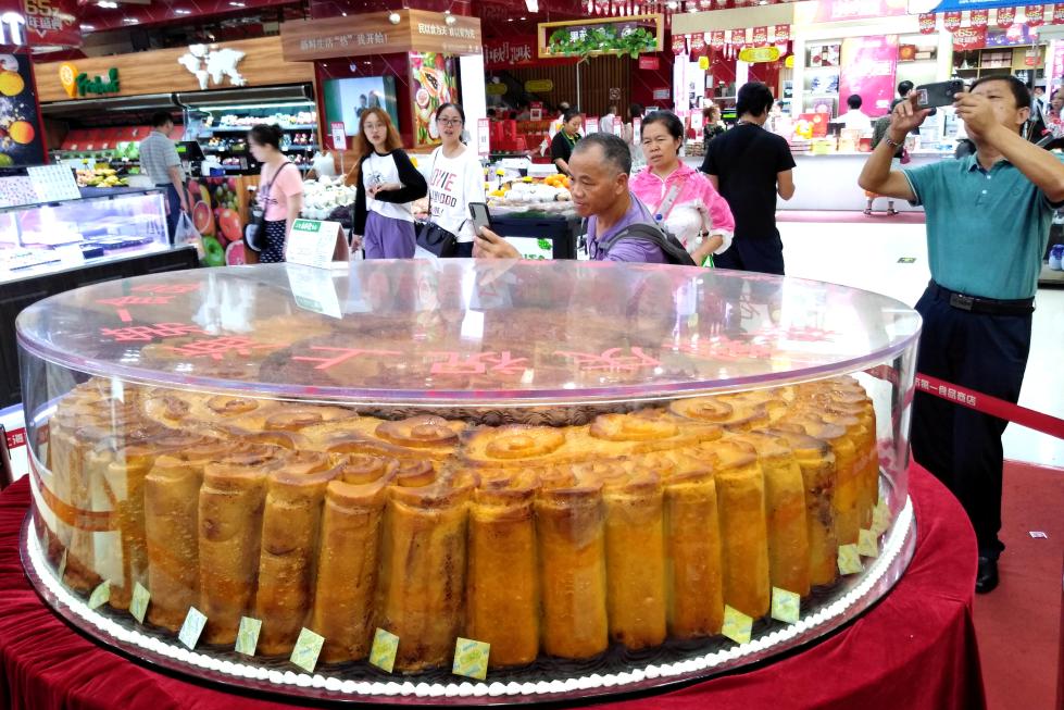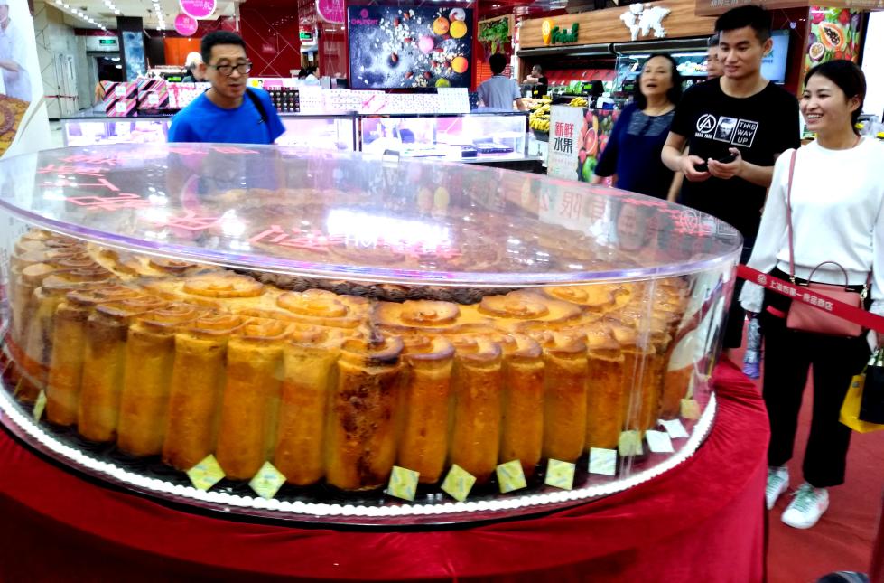 2019年9月4日,上海,一只重達365公斤的巨型月餅近日出現在第一食品商店內,引來(lái)眾多市民圍觀(guān)。這只月餅由老香齋非遺傳承人制作,直徑接近1.48米,重量為365公斤,使用了10多種餡料,工序相當龐大、繁雜。而這只月餅的售價(jià)也是相當驚人,標價(jià)達128000元。據悉,這只巨型月餅是第一食品商店為2019中秋月餅節而制作,今年同時(shí)也是第一食品商店開(kāi)業(yè)65年。