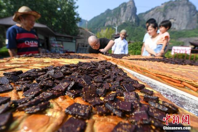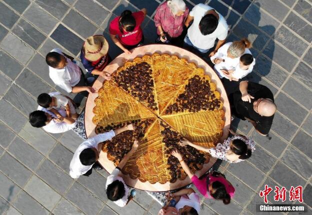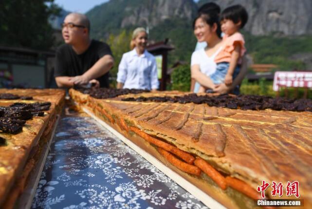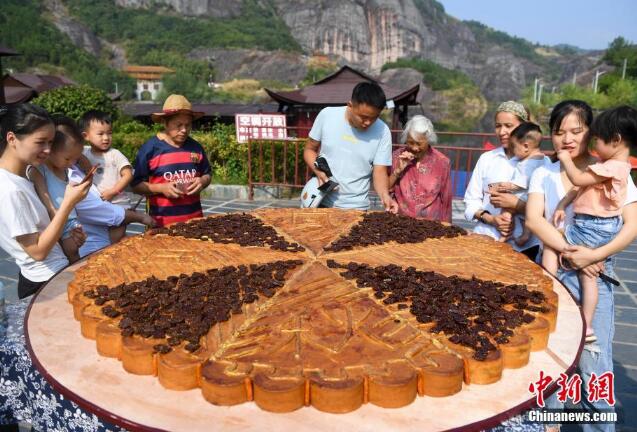 9月12日,一塊直徑2米的巨型辣條月餅亮相湖南省平江縣石牛寨,吸引眾多游客與當地村民。據了解,該月餅重達500斤,用平江辣條和辣醬干為餅餡,耗時(shí)3天制作完成。