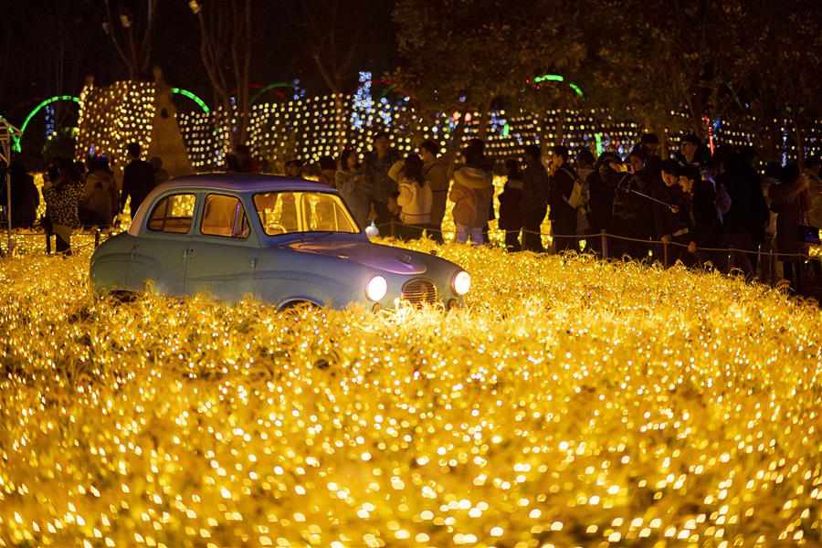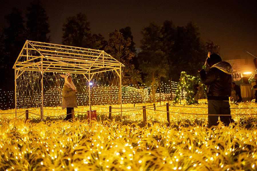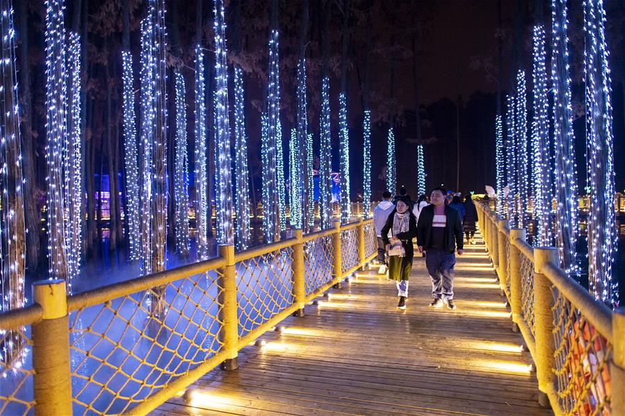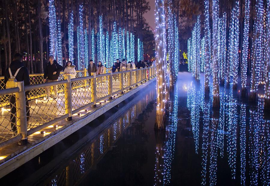 12月24日,游客在武漢歡樂(lè )谷的燈海中游玩。 時(shí)值歲末,武漢歡樂(lè )谷舉辦奇幻燈光節,亮起各式彩燈,吸引不少游客前來(lái)游玩。