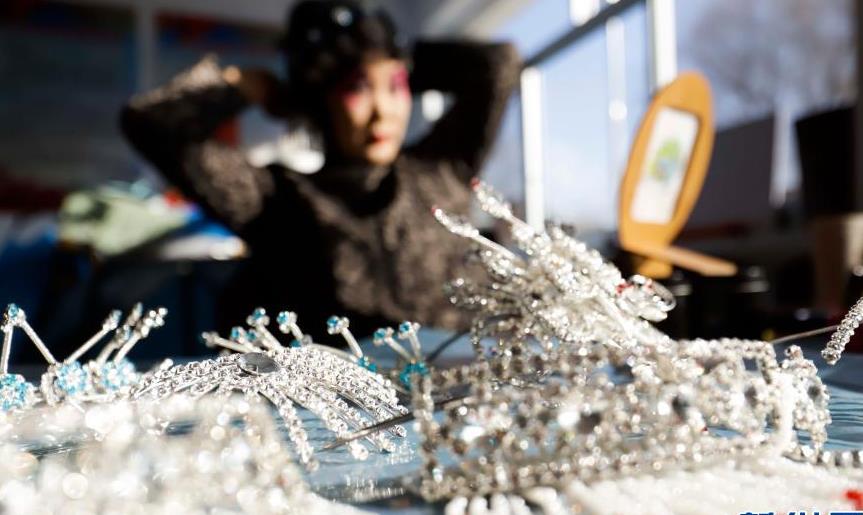 12月14日,在遵化市東舊寨鎮東舊寨村,演員在演出前進(jìn)行妝扮。進(jìn)入冬季,河北唐山遵化市組織文藝團體開(kāi)展送戲下鄉惠民演出活動(dòng),以豐富農民冬閑時(shí)節的文化生活,受到農民歡迎。