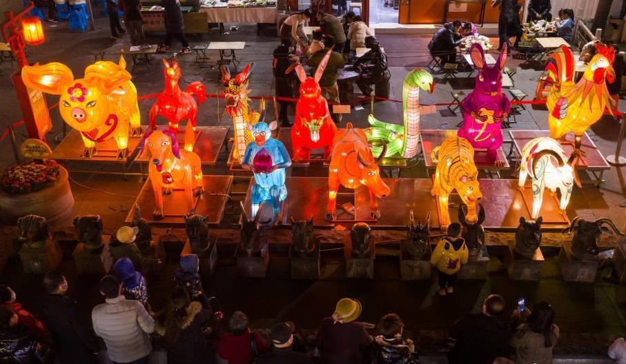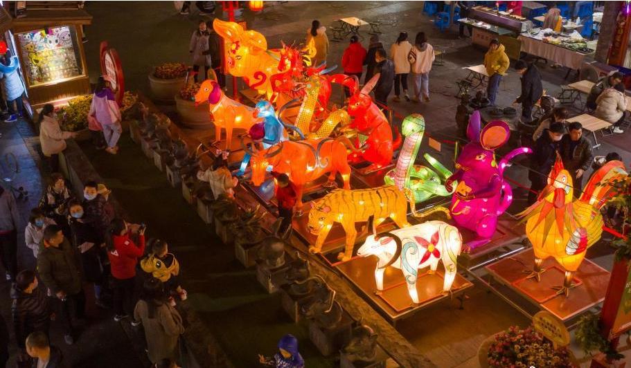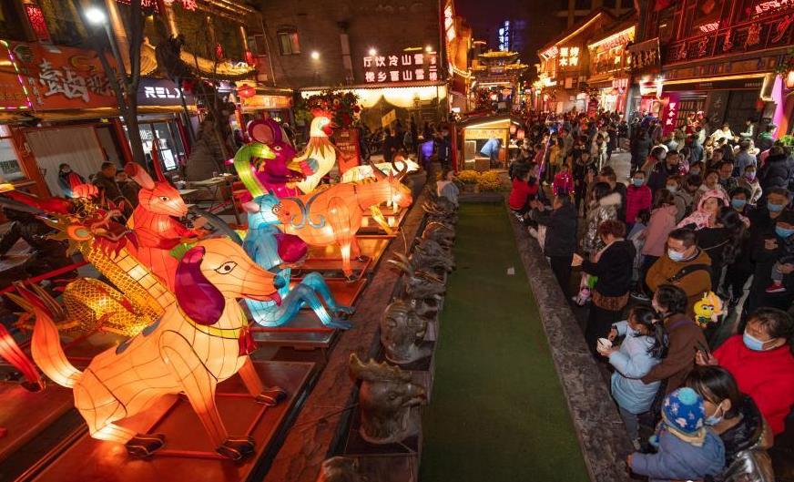 2月25日,山西太原食品街,十二生肖造型的花燈吸引游客駐足欣賞。