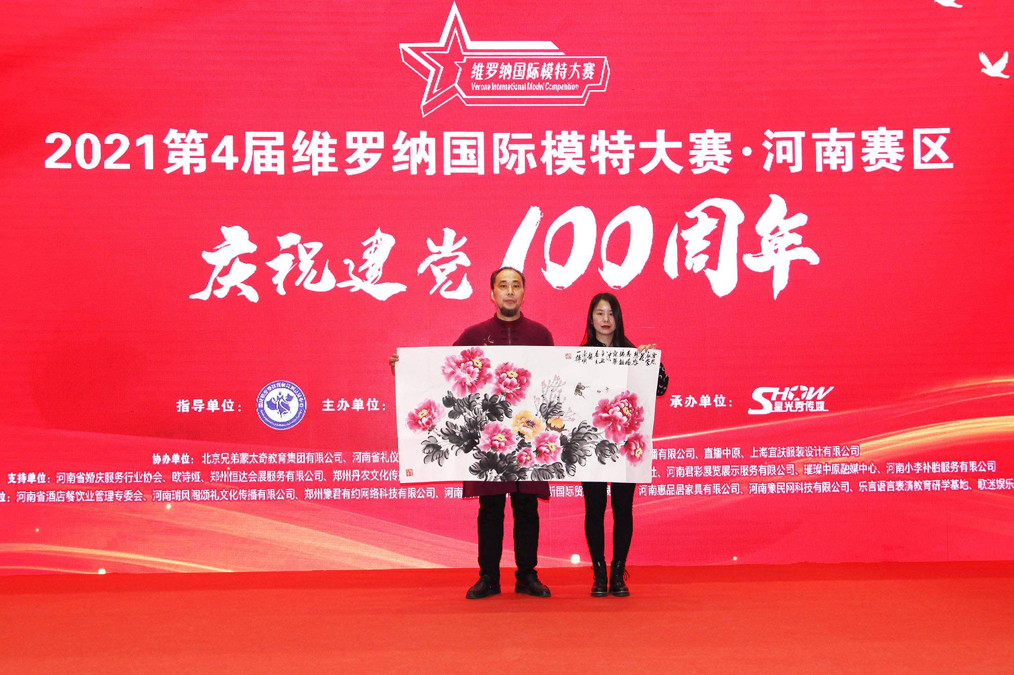 慶祝建黨100周年儀式上,來(lái)自璀璨中原藝術(shù)學(xué)院副院長(cháng)王文女士為大家獻上的歌曲《祝福祖國》,清脆悅耳,激昂豪邁、催人奮進(jìn),感染了每一位觀(guān)眾。鄭州東方翰墨書(shū)畫(huà)院院長(cháng),中國美術(shù)家協(xié)會(huì )會(huì )員,中國國畫(huà)家協(xié)會(huì )會(huì )員,國家一級美術(shù)師趙景順先生,為大賽組委會(huì )贈送的精心畫(huà)的牡丹畫(huà),線(xiàn)條,構圖,上色,簡(jiǎn)直是惟妙惟肖,妙筆生輝。還有一位來(lái)璀璨中原藝術(shù)團團長(cháng)賈永安先生,為大家奉上的詩(shī)朗誦《我驕傲,我是中國龍》,聽(tīng)著(zhù)他帶著(zhù)富有磁性的聲音朗誦,極富表現力,把作品的思想感情都呈現出來(lái)了,深深地打動(dòng)了每一位人,在大家的熱烈掌聲中結束了2021第4屆維羅納國際模特大賽河南賽區啟動(dòng)儀式。